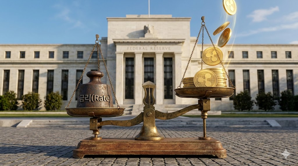 [이미지 프롬프트: 미국 연방준비제도(Fed) 건물 앞에 놓인 낡은 저울, 한쪽에는 '금리(Rate)'라는 무거운 추가 내려가고 있고 반대쪽에는 황금색 XRP 코인이 하늘로 솟구쳐 오르는 모습, 사실적인 3D 렌더링, 16:9 비율]