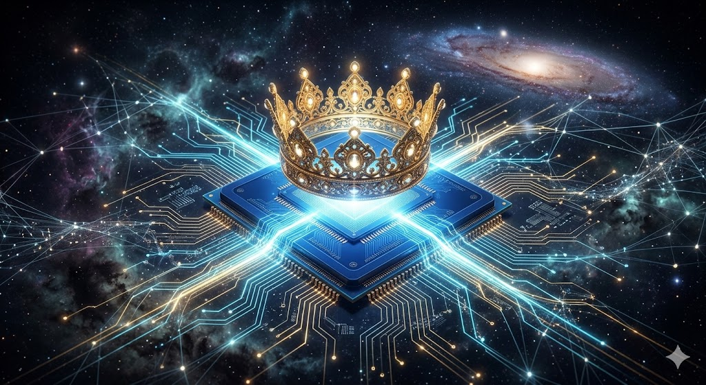 ![이미지 프롬프트: 거대한 황금색 왕관을 쓰고 있는 파란색 반도체 칩이 빛나고 있고, 그 주변에 수많은 데이터 라인이 연결되어 있는 모습. 배경은 어두운 우주, 고화질 3D 렌더링]