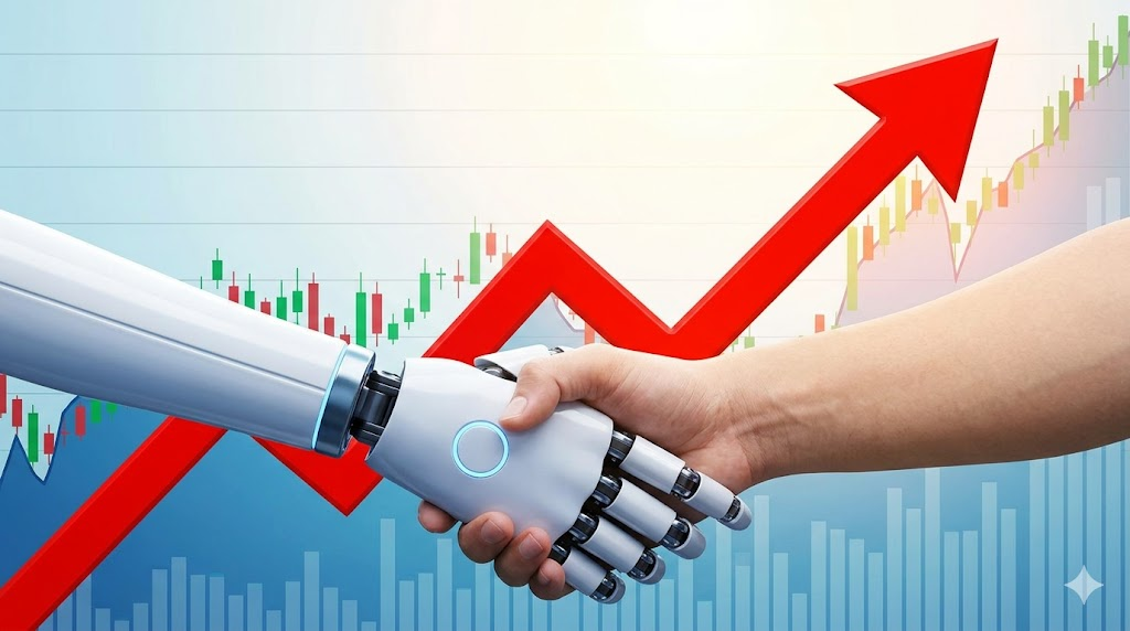 [이미지 프롬프트: 붉은색 상승 화살표가 그려진 주식 차트와 서로 굳게 악수하고 있는 로봇의 손과 사람의 손, 고화질, 16:9 비율, 밝고 희망찬 조명]