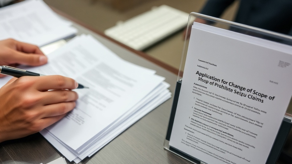 <AI 작성 이미지: 법원 민원실 창구에서 서류 더미를 꼼꼼하게 작성하고 있는 사람의 손 클로즈업, 옆에는 '압류금지채권 범위변경 신청서'라는 제목이 선명하게 보이는 문서가 놓여 있음>