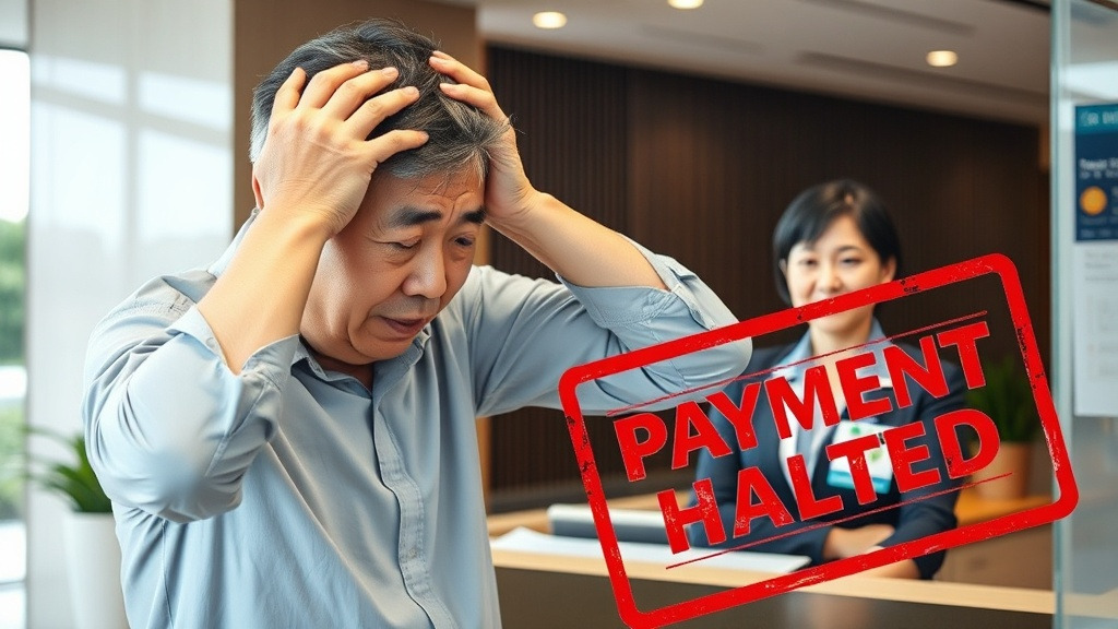 <AI 작성 이미지: 은행 창구 앞에서 난처한 표정으로 머리를 감싸 쥐고 있는 중년 남성과 그를 안타깝게 바라보는 은행 직원의 모습, 책상 위에는 '지급 정지'라고 적힌 붉은 도장이 찍힌 서류가 놓여 있음>