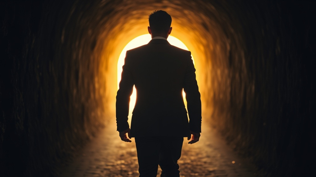 <AI 작성 이미지: 어두운 터널을 지나 밝은 빛이 들어오는 출구를 향해 걸어가는 양복 입은 남자의 뒷모습, 희망차고 따뜻한 분위기의 조명 연출>